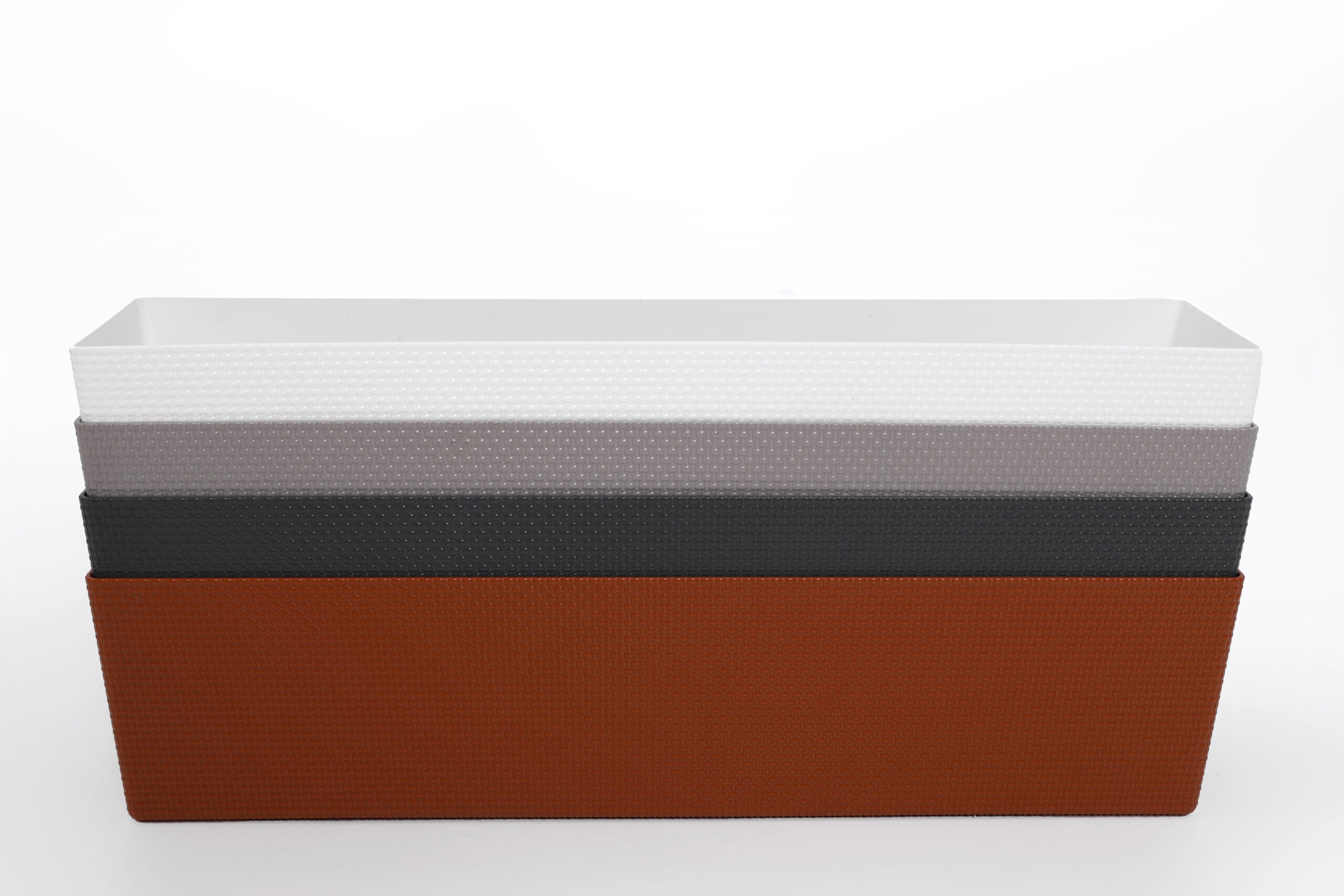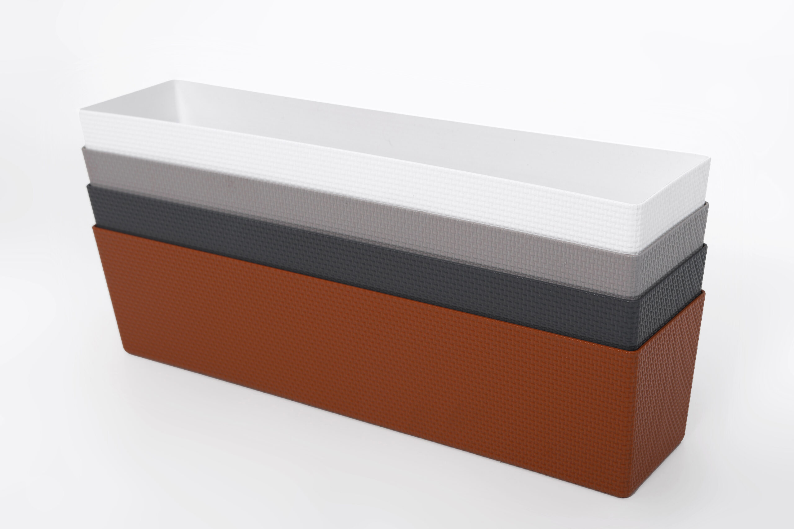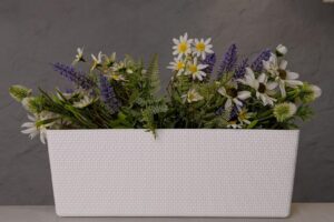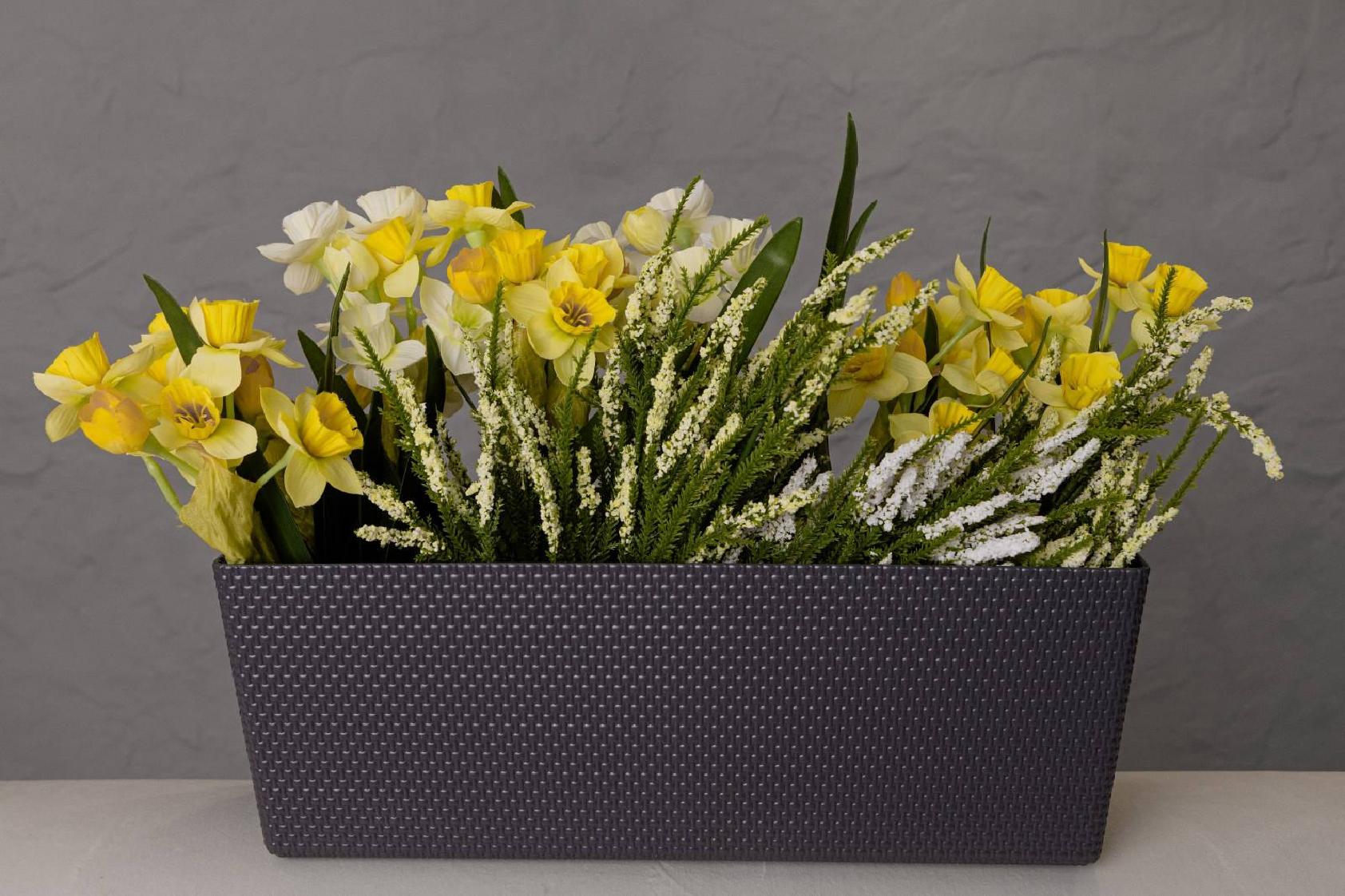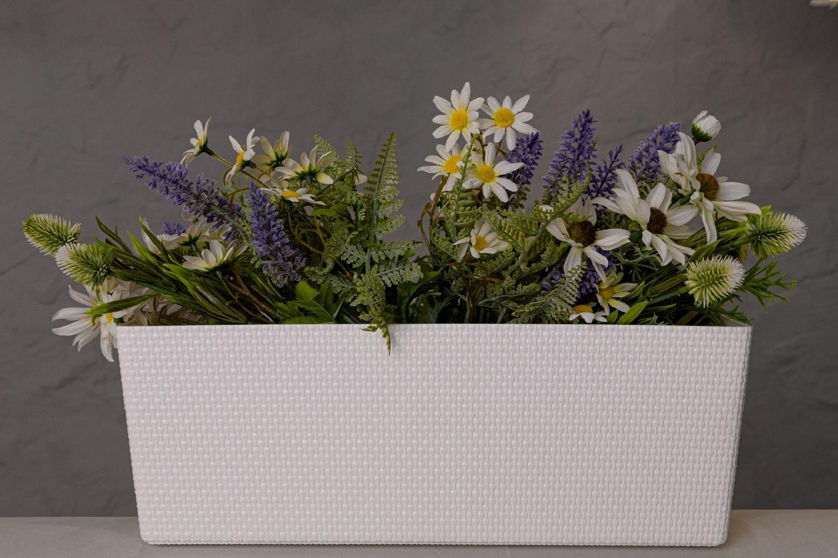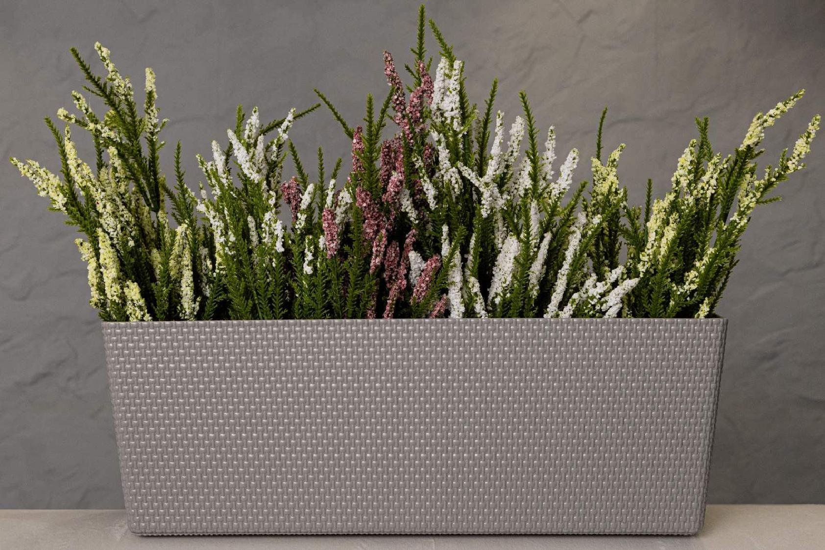 Горщик балконний Канна, прямокутної форми, має текстуру привабливого декоративного плетіння , обладнаний вставкою, яка завдяки дренажним отворам, запобігає надмірному зволоженню.