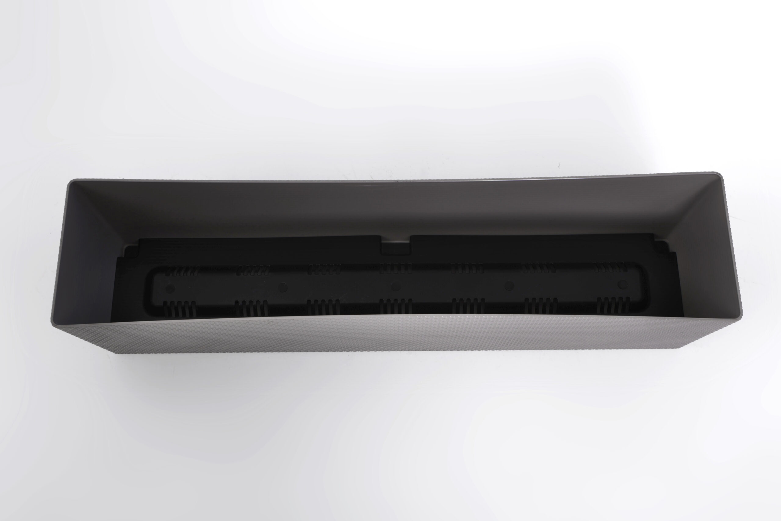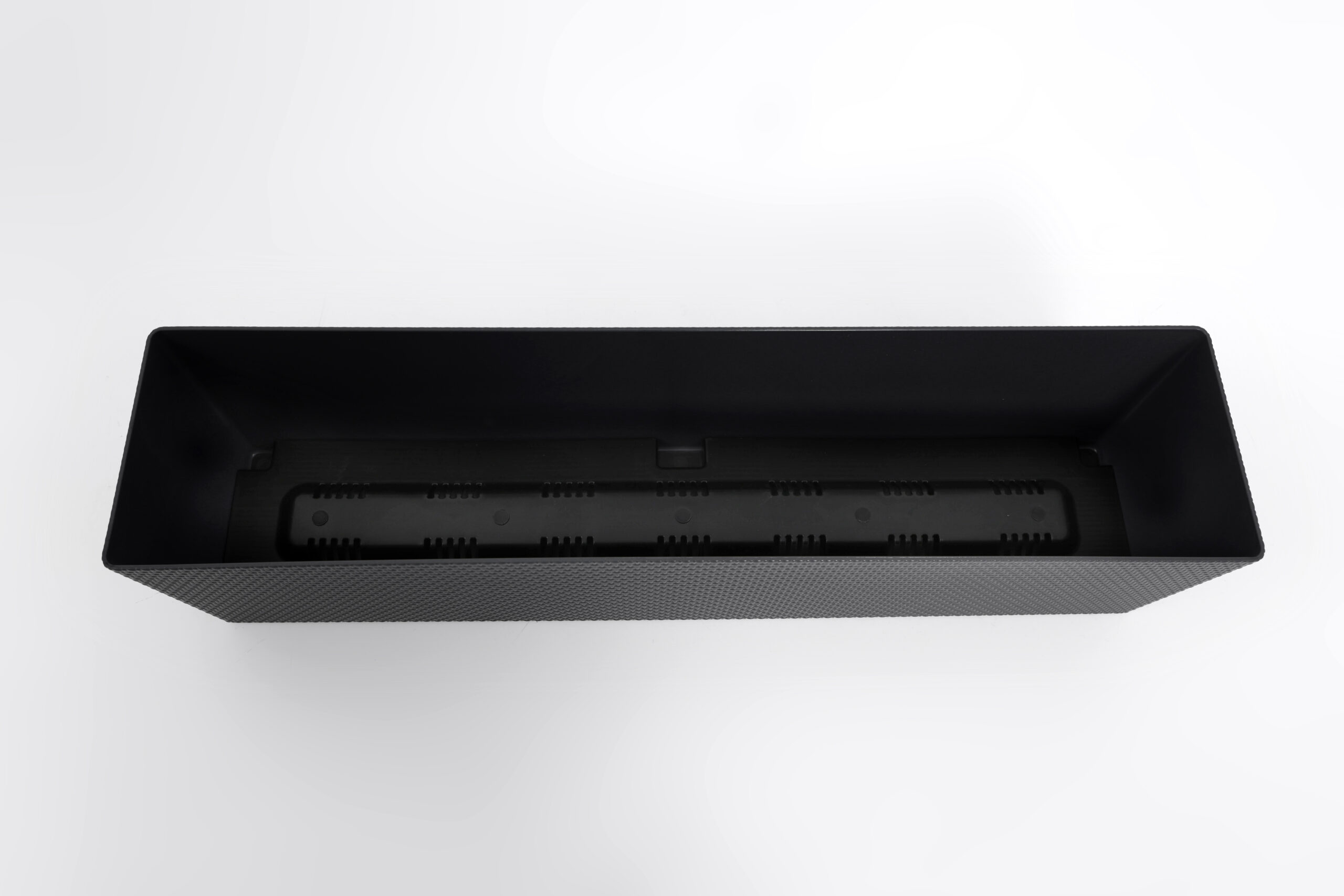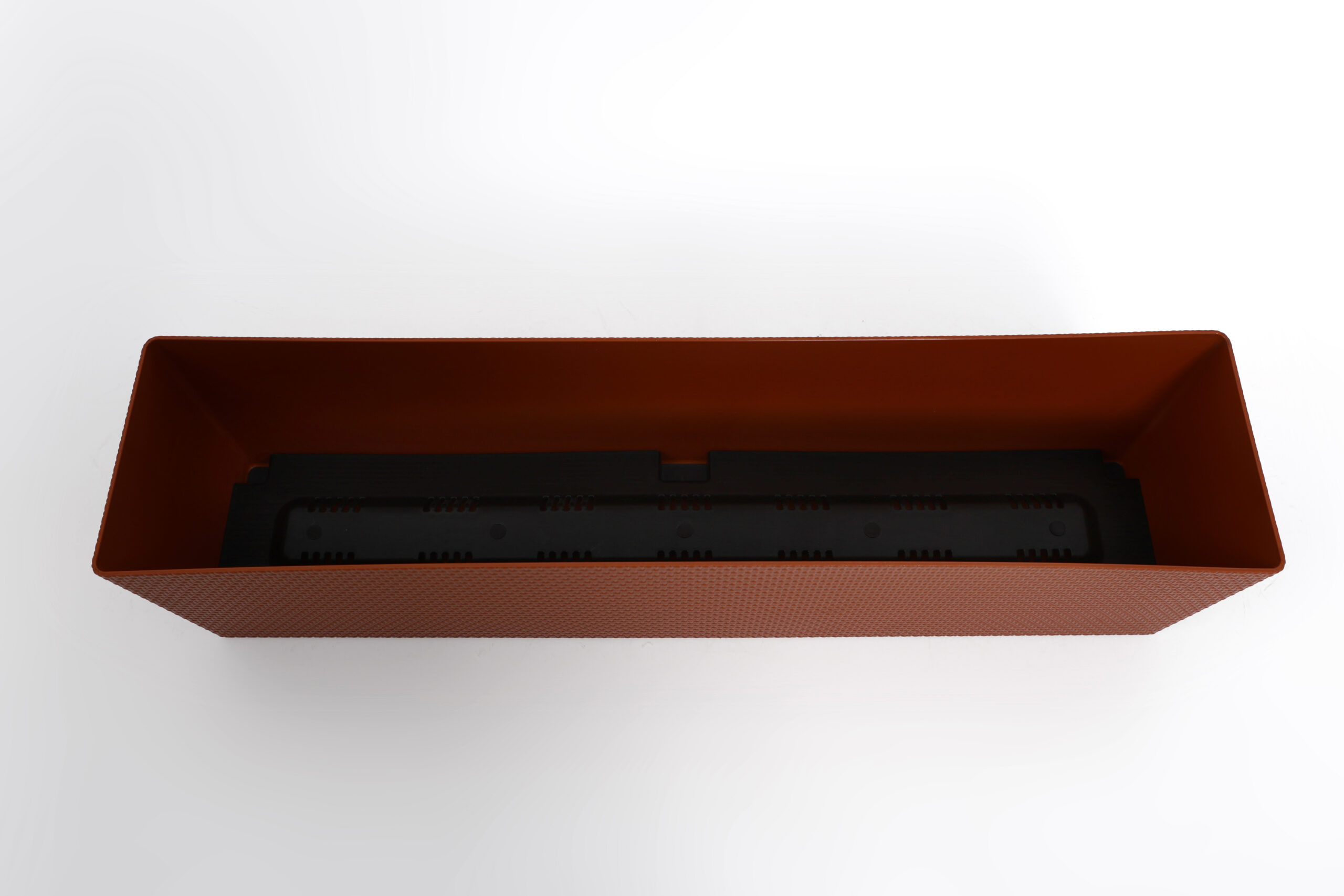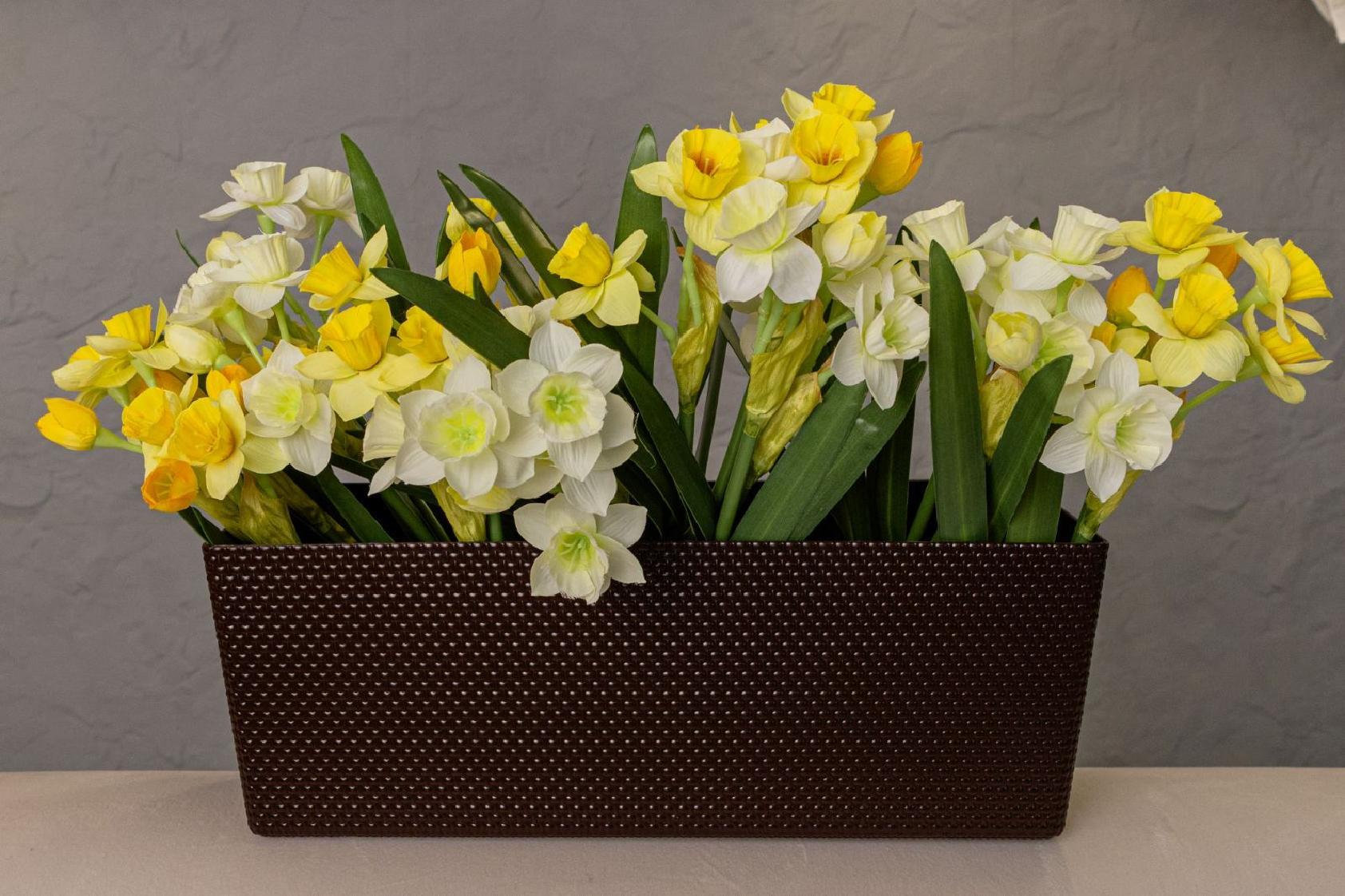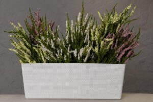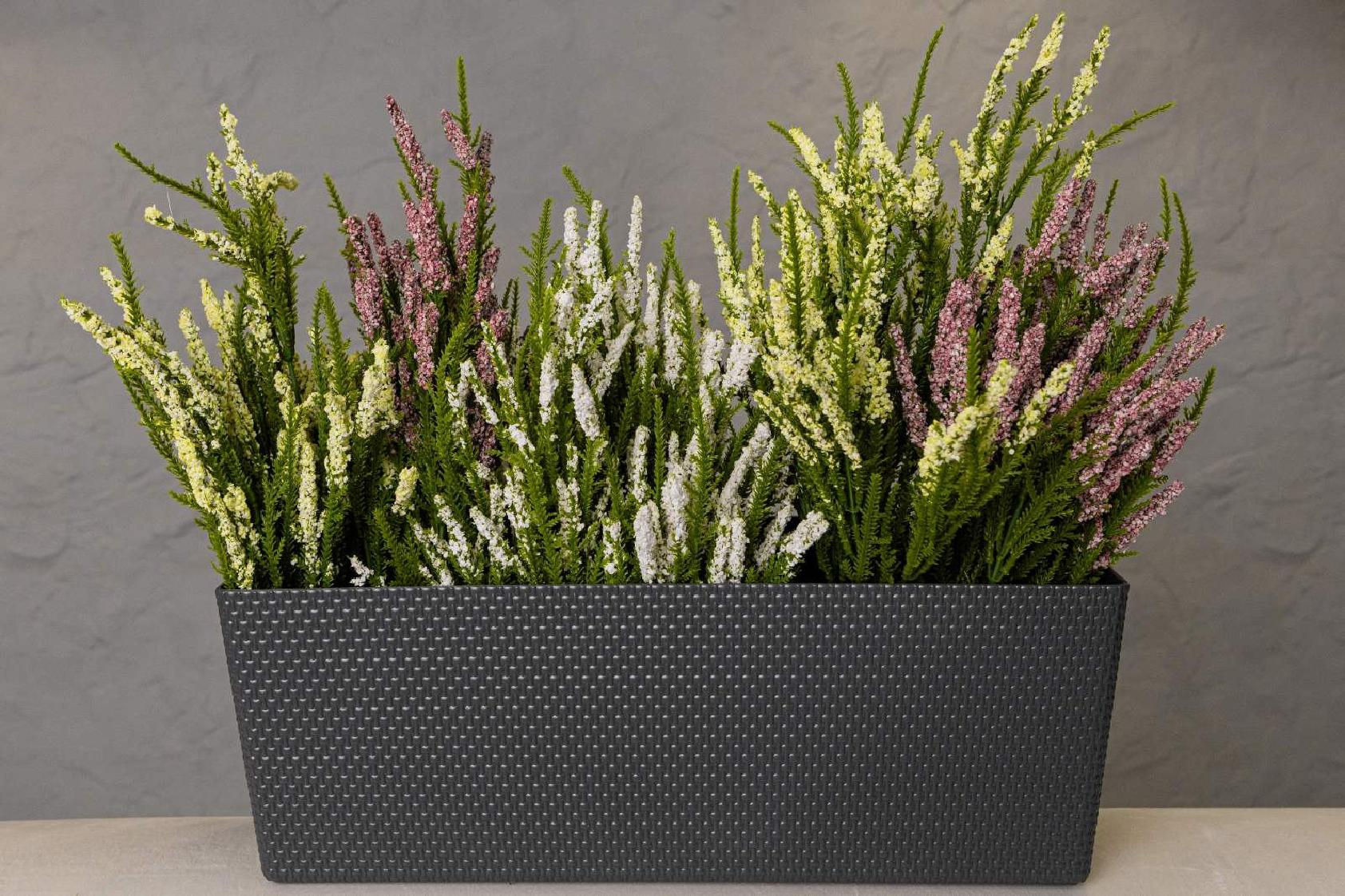 Горщик балконний Канна, прямокутної форми, має текстуру привабливого декоративного плетіння , обладнаний вставкою, яка завдяки дренажним отворам, запобігає надмірному зволоженню.