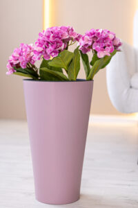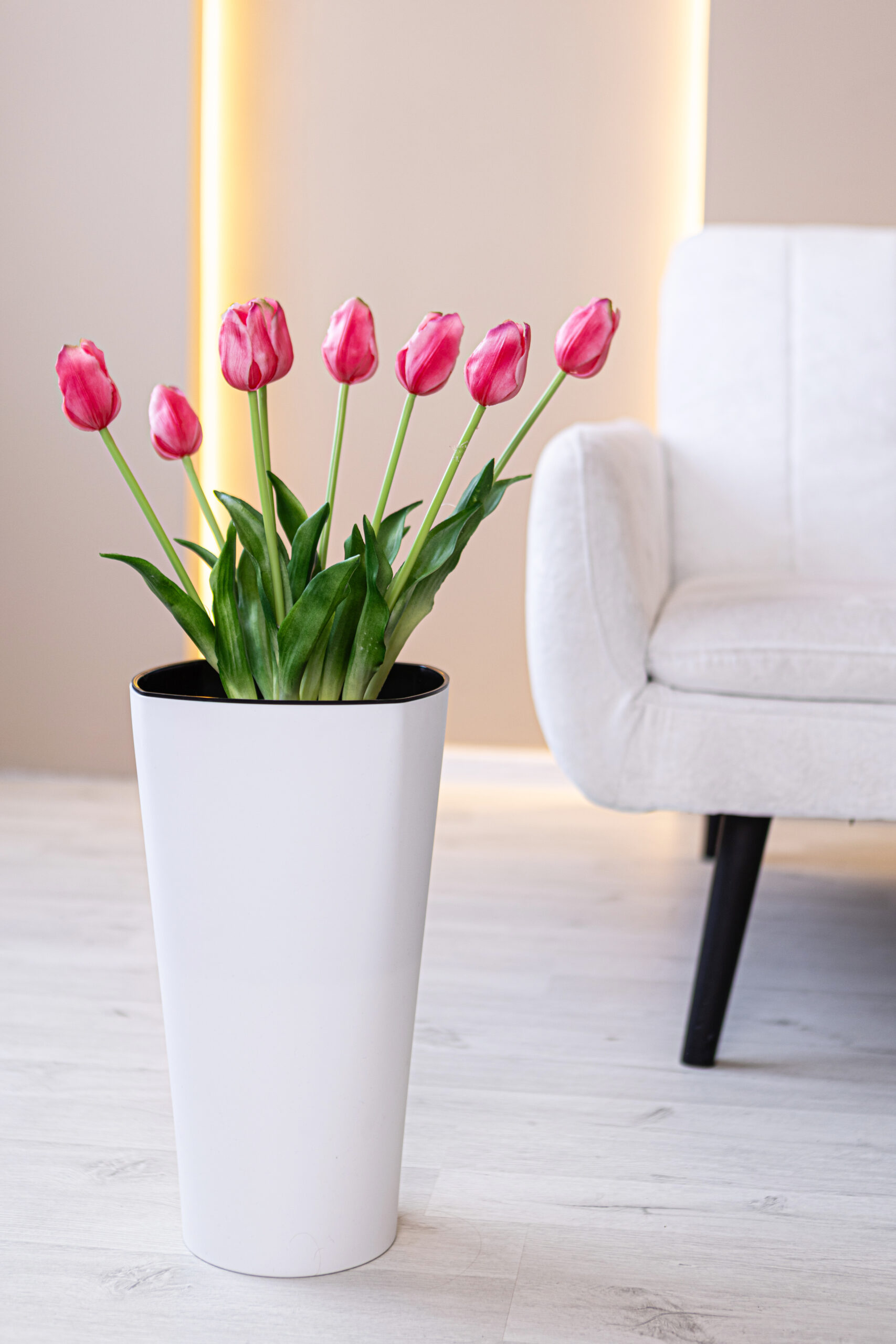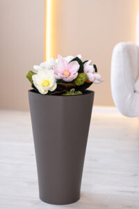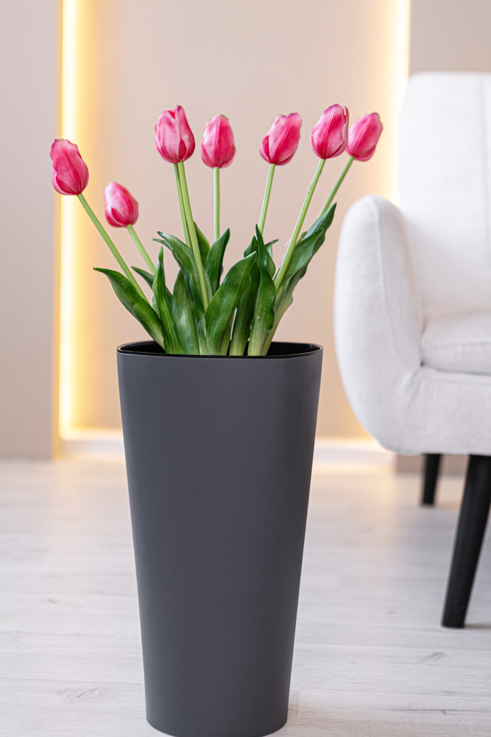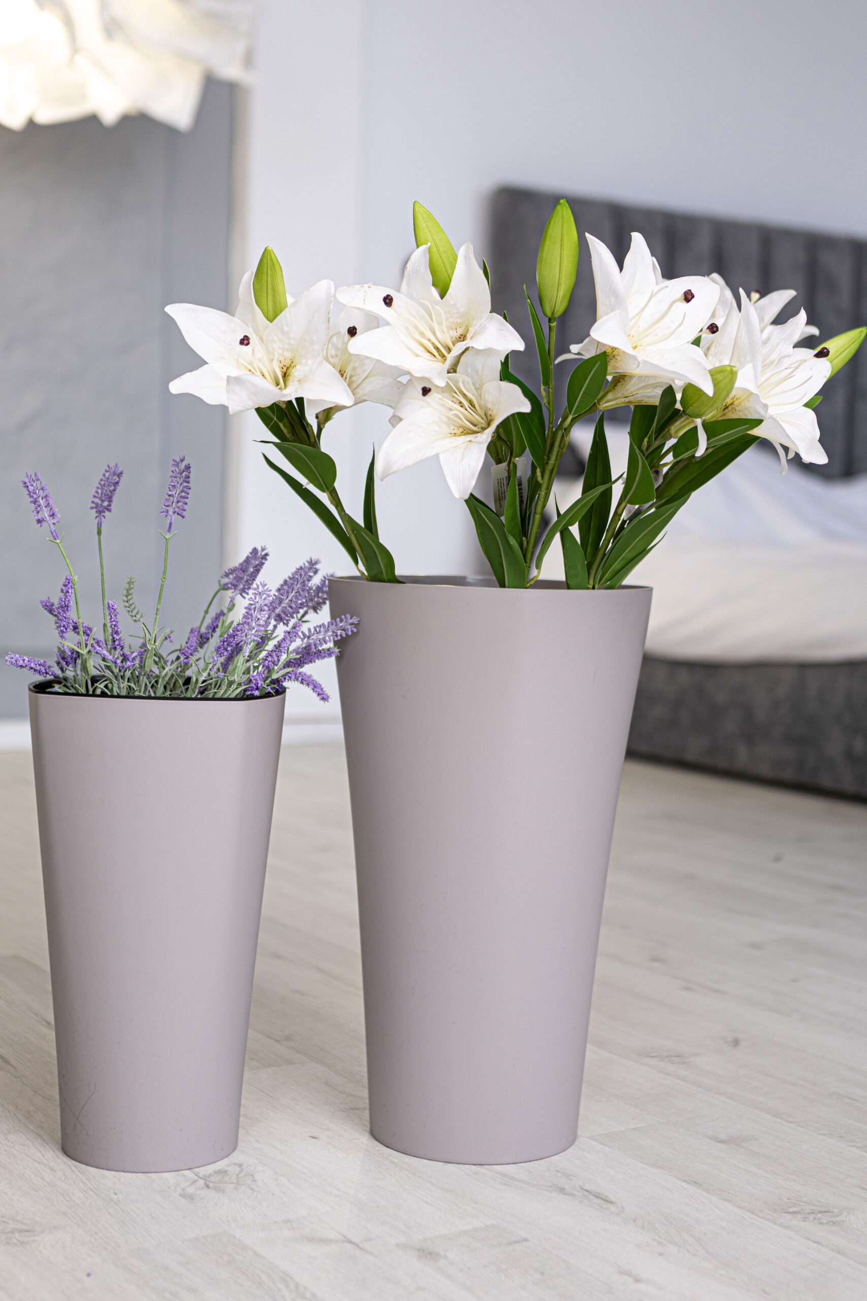 Пластиковий горщик для квітів, виконаний в сучасному стилі, має лаконічний та елегантний дизайн, поверхня шагрень. Має високу, злегка конічну форму, звужуючись донизу. Вставка зробить посадку рослини та догляд зручнішим. Горщик добре підходить для інтер’єру або вуличного використання .
