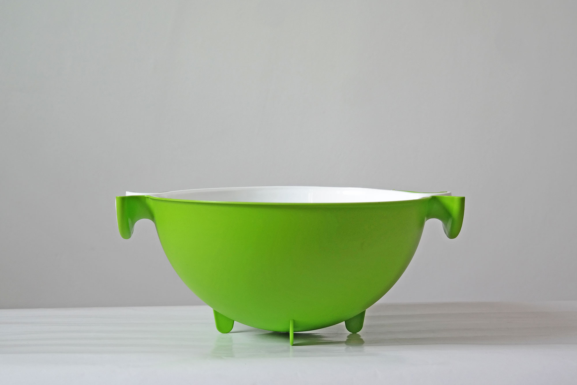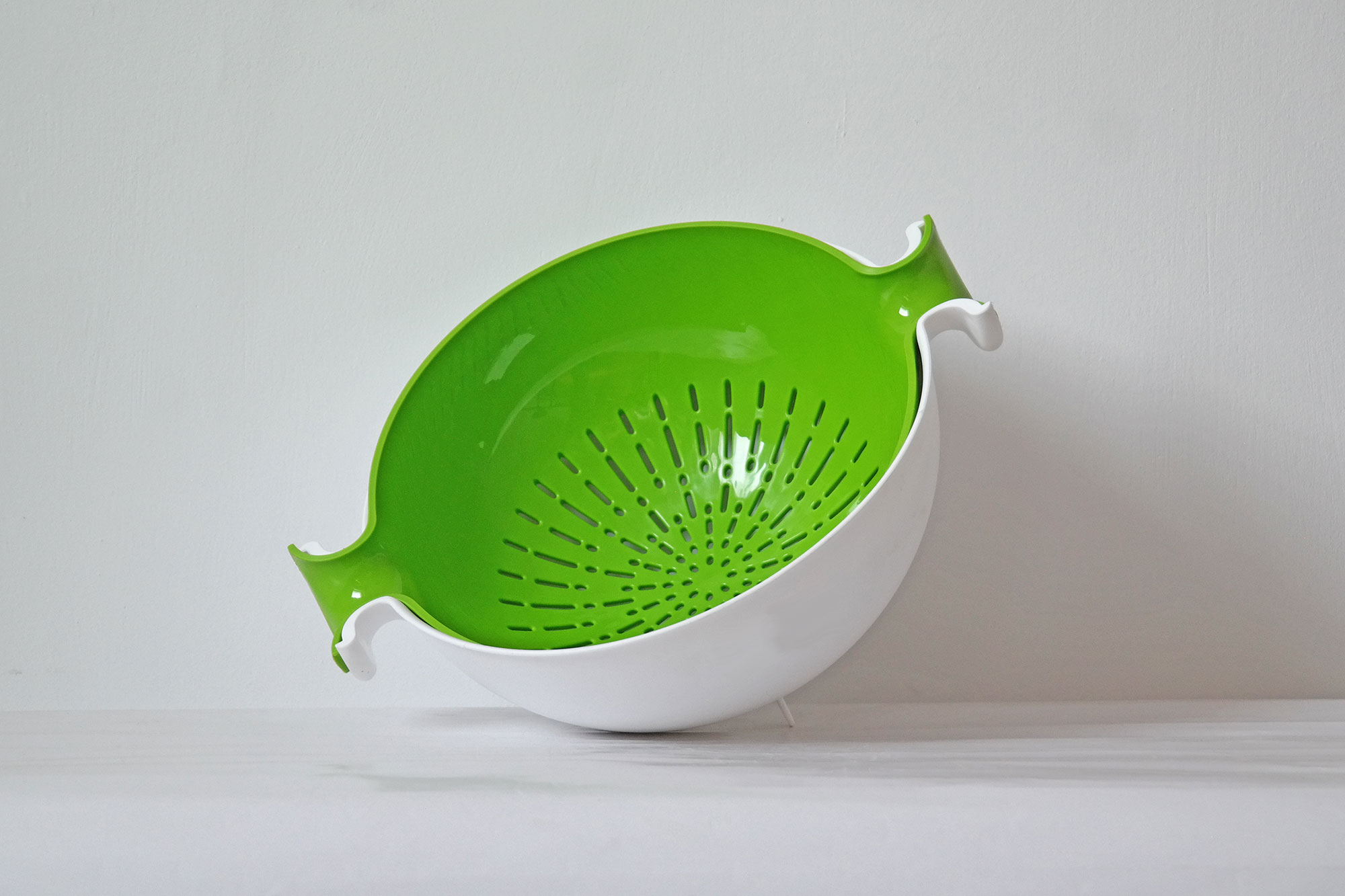 Яскравий набір з друшляка і миски поєднує в собі функціональність і оригінальний дизайн, можуть використовуватися разом або окремо один від одного. За допомогою спеціальної системи обертання вода легко зливається з друшляка, а продукти залишаються чистими і готовими до вживання.