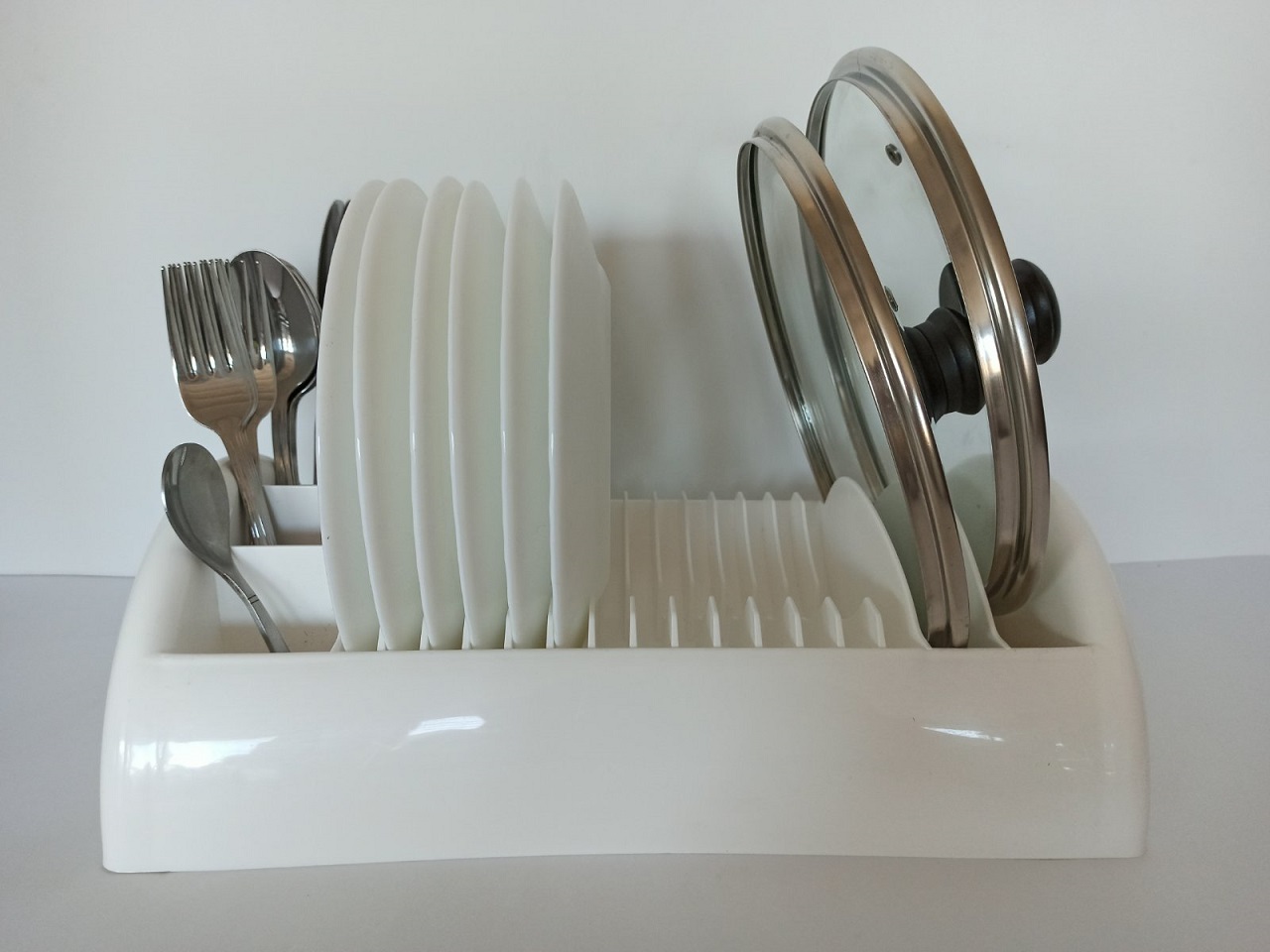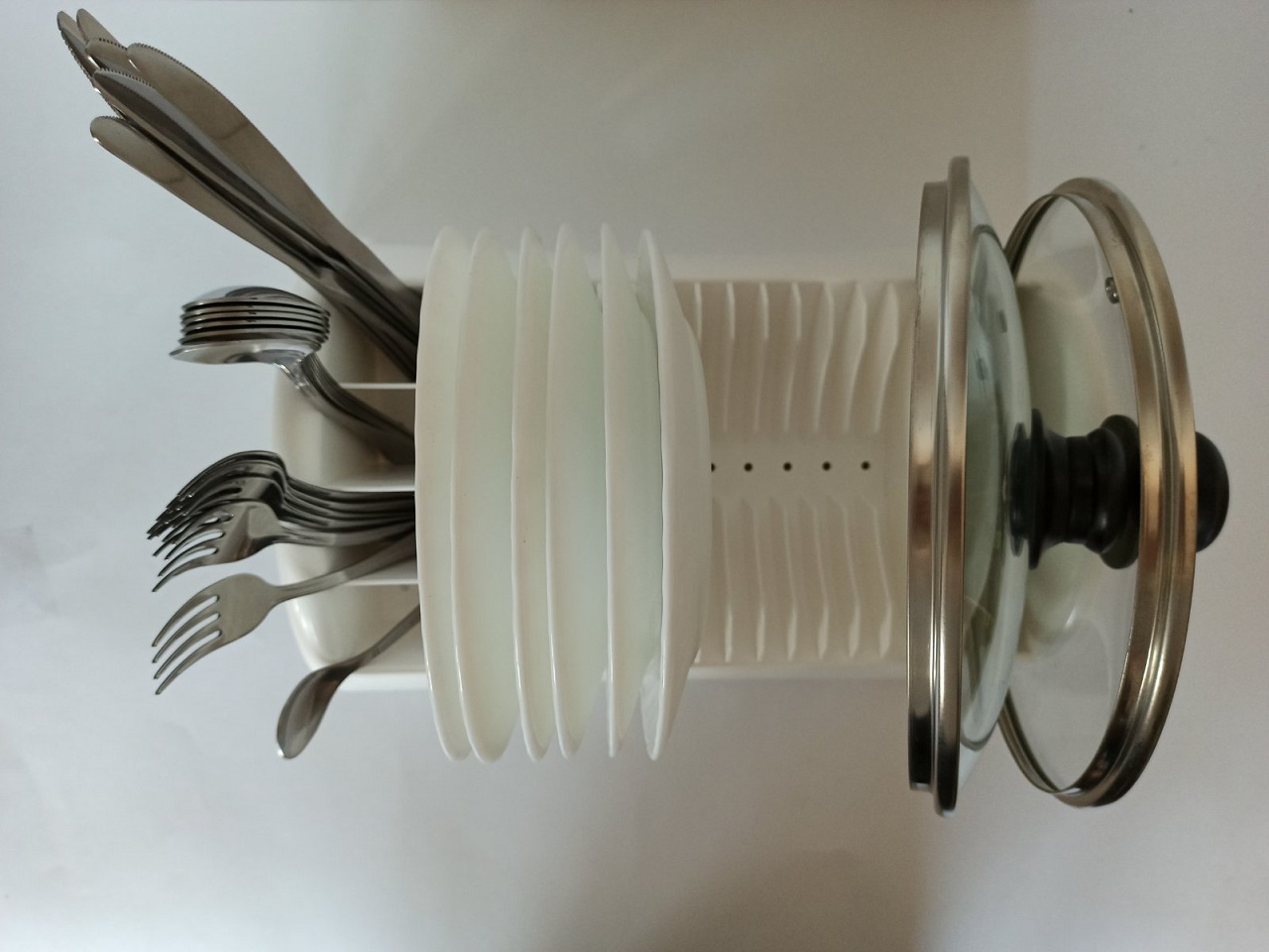 Компактна, стильна сушка для посуду укомплектована підставкою для зберігання столових приборів, тарілок, кришок.
